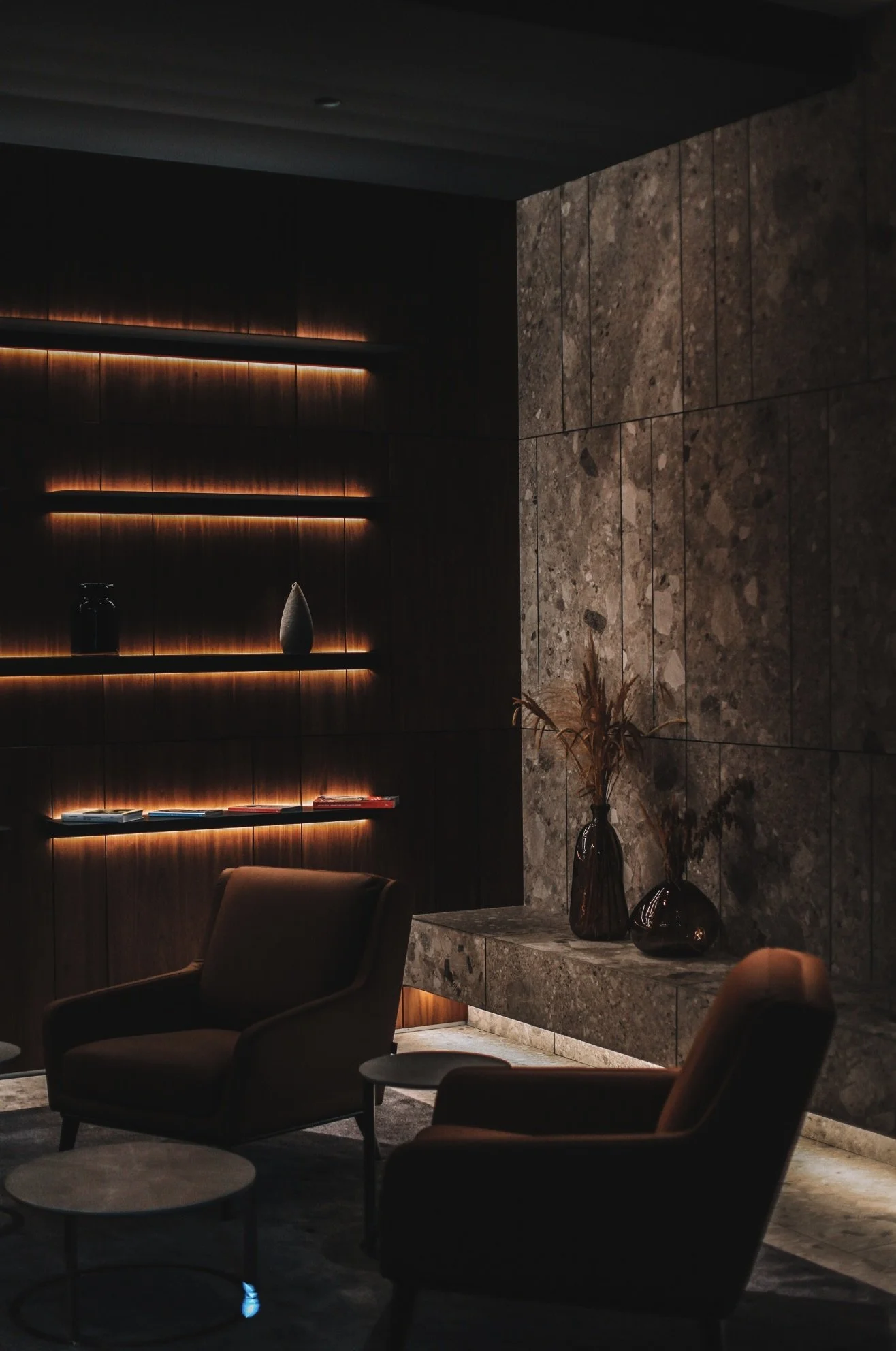 moody, deep hues of red, blue, black and earthy tones, burnished metals and stone accents, a sophisticated feel