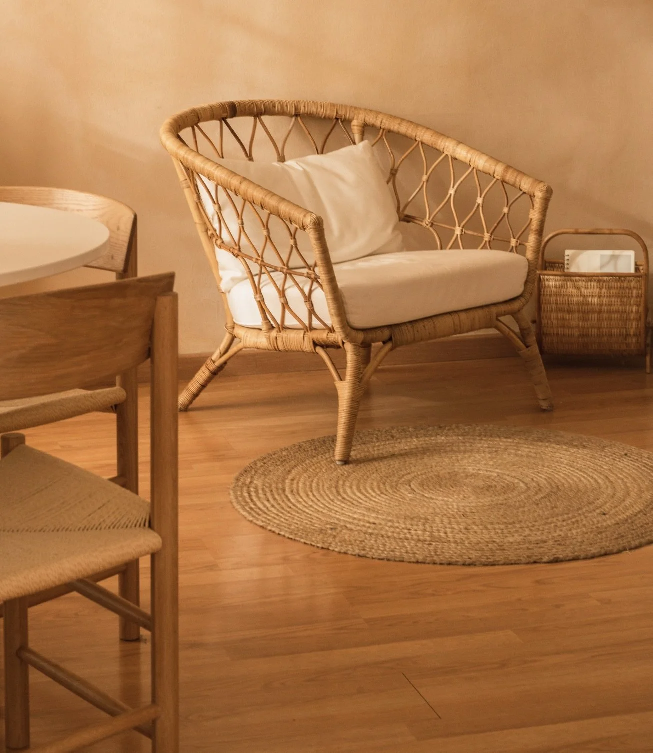 casual, comforting colors and textiles, wood and woven natural materials, soothing and functional